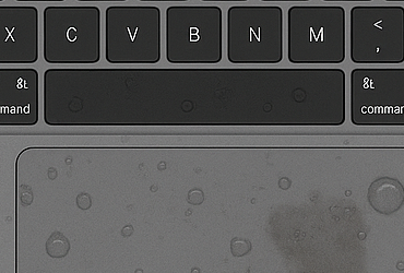 Common symptoms of water damage include unresponsive power, random shutdowns, distorted display, keyboard or trackpad malfunctions, and corrosion visible on internal components.